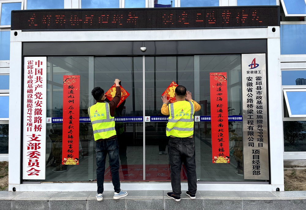 春節(jié)期間,霍邱縣市政基礎(chǔ)設(shè)施提升PPP項(xiàng)目值守人員與工友為項(xiàng)目門窗貼上春聯(lián)、福字,大家一起準(zhǔn)備了年夜飯,共度佳節(jié),感受別樣的家的溫暖。