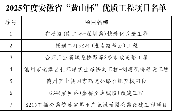 近日,安徽省住房和城鄉(xiāng)建設(shè)廳公布了2025年度安徽省“黃山杯”優(yōu)質(zhì)工程項(xiàng)目名單,公司7個項(xiàng)目榮耀登榜,創(chuàng)下公司年度獲獎數(shù)量歷史新高,獎項(xiàng)涵蓋公路、市政等多個領(lǐng)域,充分彰顯了公司在工程建設(shè)領(lǐng)域的雄厚技術(shù)實(shí)力與精益求精的匠心品質(zhì)。