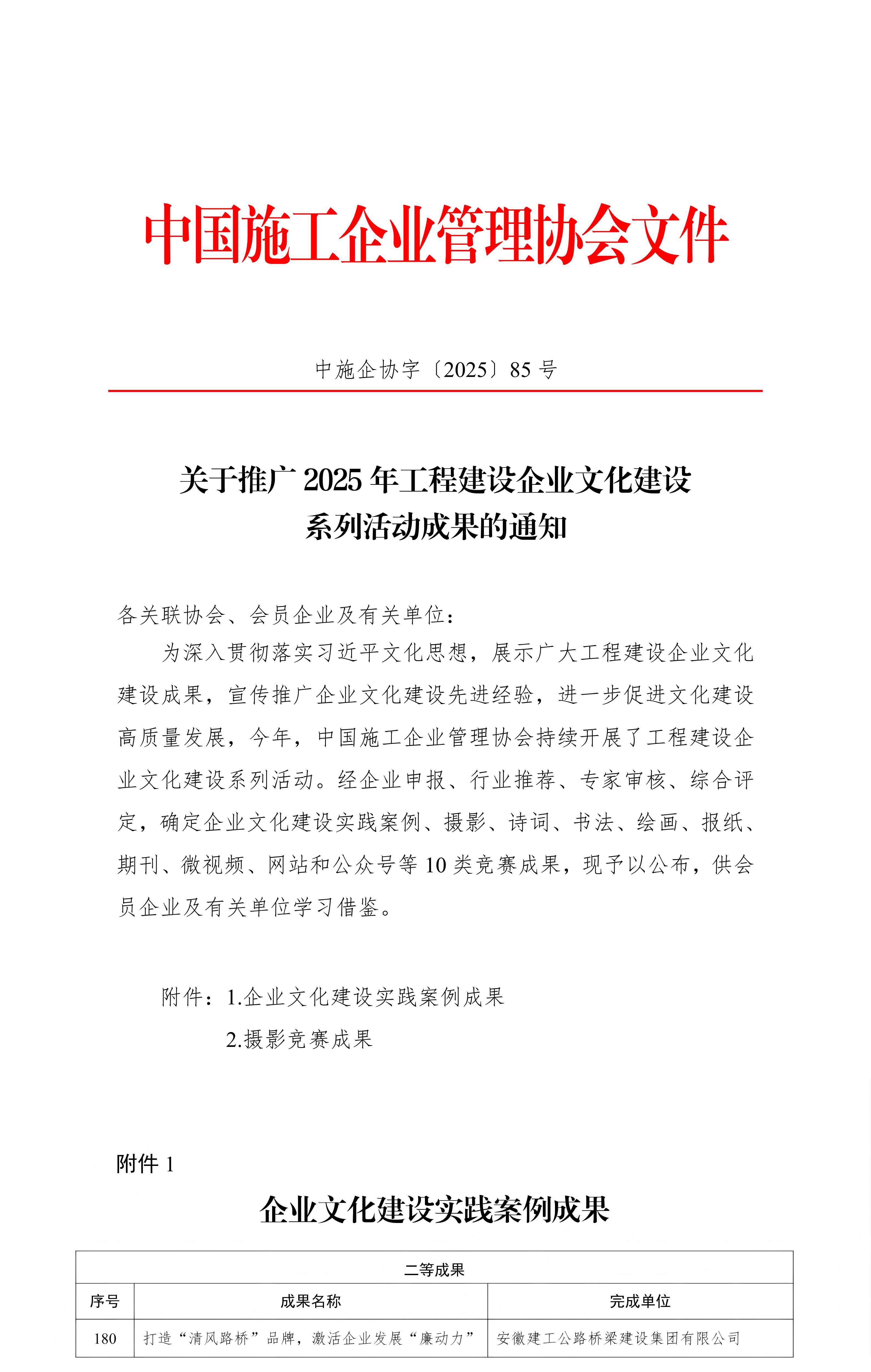 近日,中國施工企業(yè)管理協(xié)會公布了2025年工程建設(shè)企業(yè)文化建設(shè)實(shí)踐案例成果評選結(jié)果,公司《打造“清風(fēng)路橋”品牌,激活企業(yè)發(fā)展“廉動力”》從全國眾多申報案例中脫穎而出,榮獲企業(yè)文化建設(shè)實(shí)踐案例二等成果。這是繼上半年公司“清風(fēng)路橋”廉潔文化品牌獲評2025年工程建設(shè)企業(yè)黨建工作典型案例后,再次獲得中國施工企業(yè)管理協(xié)會表彰,充分展現(xiàn)了公司在廉潔文化建設(shè)領(lǐng)域的持續(xù)深化與品牌影響力。