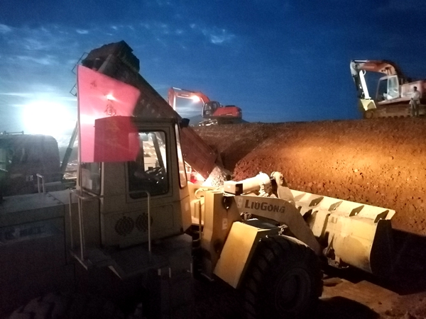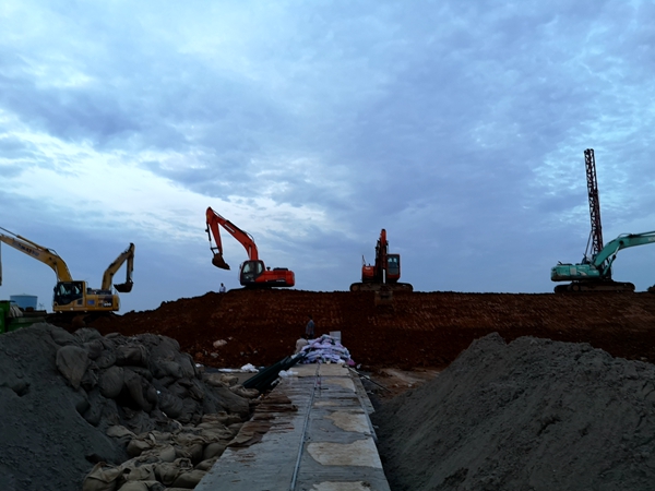巢湖市東外壞旗山撇洪溝,位于巢湖鼓山腳下,連接清溪河支流,連日降雨,清溪河水位暴漲,防汛壓力巨大,經(jīng)開區(qū)的人民生命和財產(chǎn)安全受到嚴重威脅。經(jīng)巢湖市政府研究決定,在旗山撇洪溝和清溪河支流交匯處筑壩,將撇洪溝東側(cè)低洼處作為清溪河支流泄洪預(yù)備區(qū),以應(yīng)對清溪河水位暴漲危險。接到汛情指令,巢湖市亞父路項目部迅速出動,組建防汛突擊隊,調(diào)集挖掘機、裝載機等機械設(shè)備迅速奔赴搶險一線,連續(xù)奮戰(zhàn)兩天三夜,填筑黃土近10000方,碎石1500方,拋石700噸,圓滿完成了底寬22米,上寬10米,高5米,長110米的筑壩任務(wù),確保了經(jīng)開區(qū)的人民生命和財產(chǎn)安全。