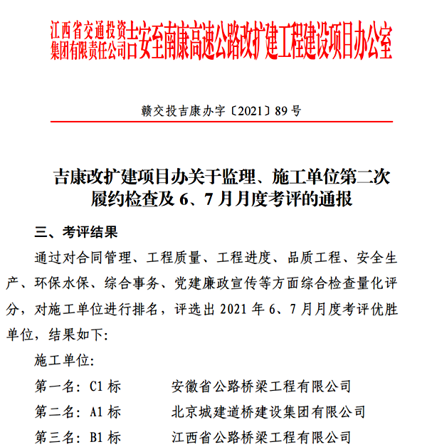 8月8日,吉康改擴(kuò)建項目辦公布了2021年6、7 月考評結(jié)果,公司承建的吉康改擴(kuò)建C1標(biāo)連續(xù)兩個月獲月度綜合考核第一名。
