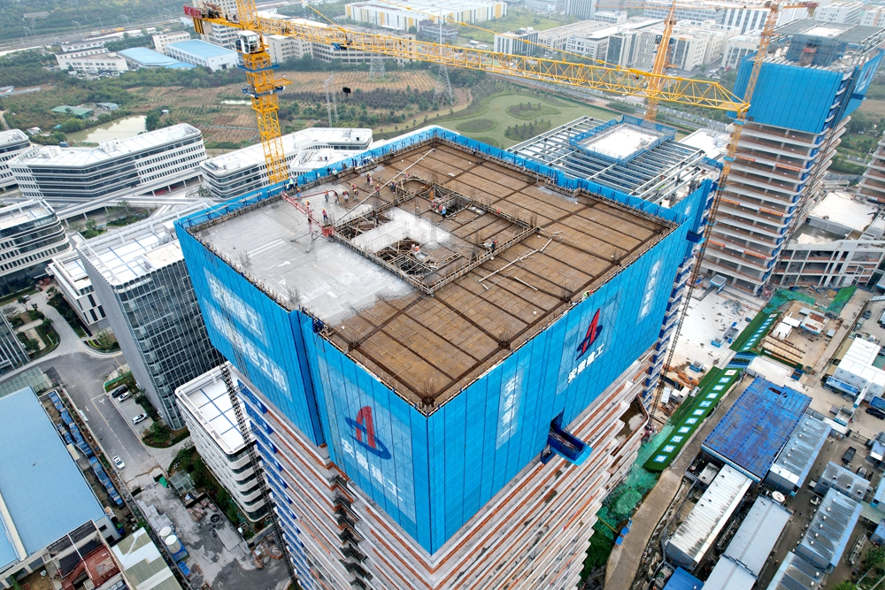 自二期建設(shè)以來,項(xiàng)目集中優(yōu)勢(shì)資源高效推進(jìn)主體結(jié)構(gòu)施工。此次完成封頂?shù)腁4#樓單體,建筑面積約37000平方米,地上建筑22層,建筑高度95.3米。建成后將成為集高端企業(yè)總部、星級(jí)酒店、辦公樓、商業(yè)會(huì)議中心等功能為一體的現(xiàn)代化辦公聚合體。