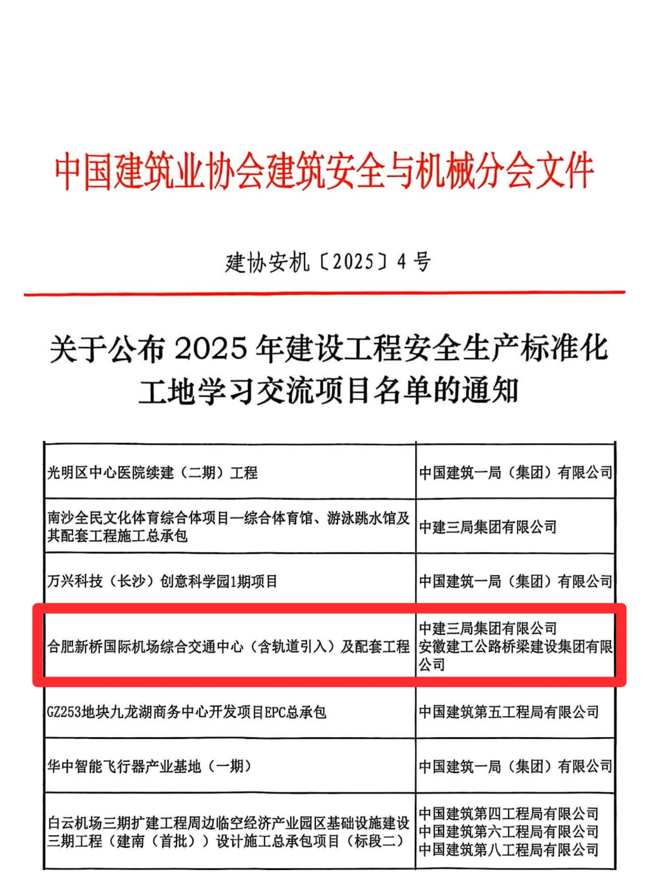 近日,中國(guó)建筑業(yè)協(xié)會(huì)建筑安全與機(jī)械分會(huì)公布2025年建設(shè)工程安全生產(chǎn)標(biāo)準(zhǔn)化工地學(xué)習(xí)交流項(xiàng)目名單,公司承建的合肥新橋國(guó)際機(jī)場(chǎng)綜合交通中心(含軌道引入)及配套工程施工總承包項(xiàng)目成功入選。