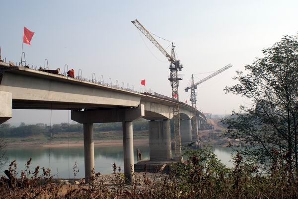 青弋江大橋全長454米,凈寬11米,結(jié)構(gòu)形式為30×10+70+42×2的簡支箱梁與現(xiàn)澆懸臂橋。該工程于2007年開工,前期由于施工條件的限制和其它不利因素,工程進展頗不順利。后來在公司領(lǐng)導(dǎo)的大力支持下,全體施工人員上下合力,積極創(chuàng)造條件進行施工,全橋終于順利合龍。盛總在合龍現(xiàn)場指出,雖然大橋已順利合龍貫通,但后期任務(wù)還相當(dāng)艱巨,橋面、護欄、橋頭搭板和護坡等都需要抓緊施工,在保證質(zhì)量、保證安全的情況下,組織力量加快施工進度,確保實現(xiàn)元月通車的目標(biāo)。